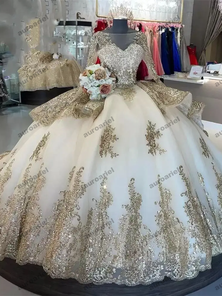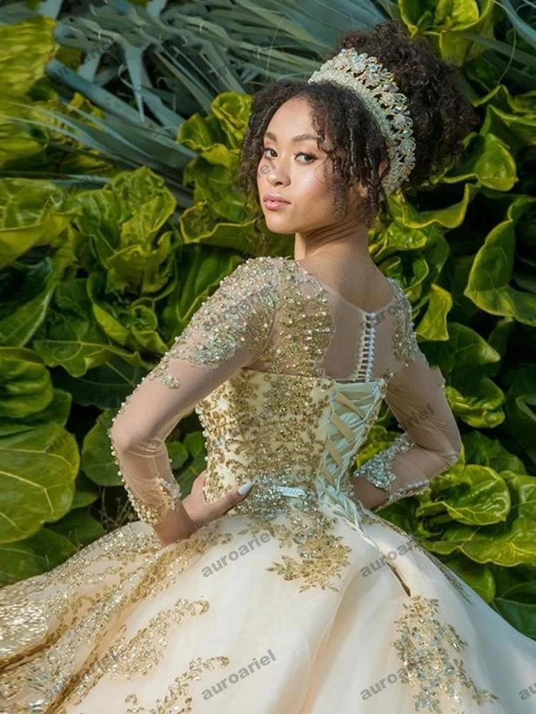 Gold Appliques Quinceanera Dresses Vestidos De 15 Anos Ball Gown Formal Birthday Party Prom Gown Corset Back Train