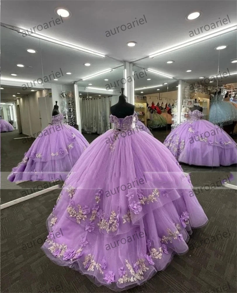Lilac Quinceanera Dresses 3D Flowers Beading Sliver Lace