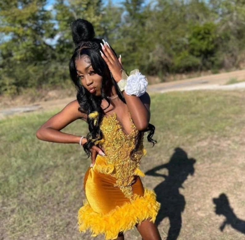 Luxury Gold Diamante Short Homecoming Party Dress Glitter Beaded Feather Black Teenage Birthday Queen Dress