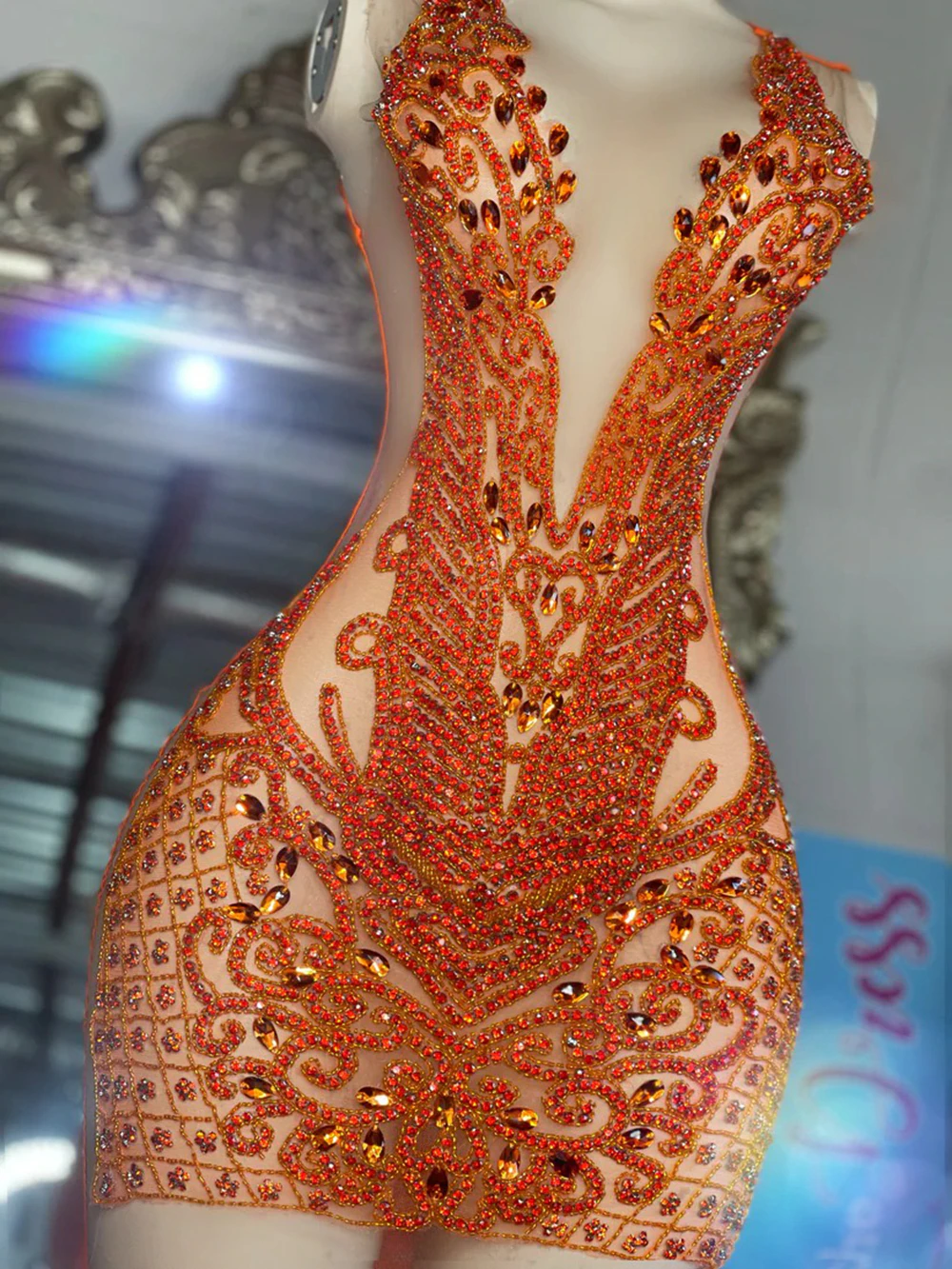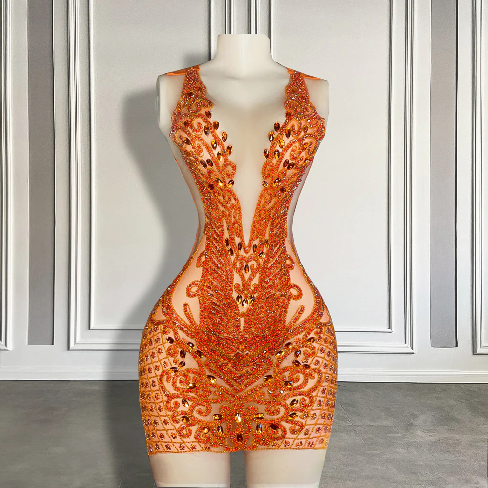 Sexy See Through Sheer O-neck Homecoming Dress Mini Style Orange Crystals Black Girls Short Prom Dresses
