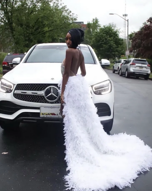 White Feathers Silt Silver Rhinestones Mermaid Prom Dresses Black Girl African Wedding Evening Dress Sheer Mesh