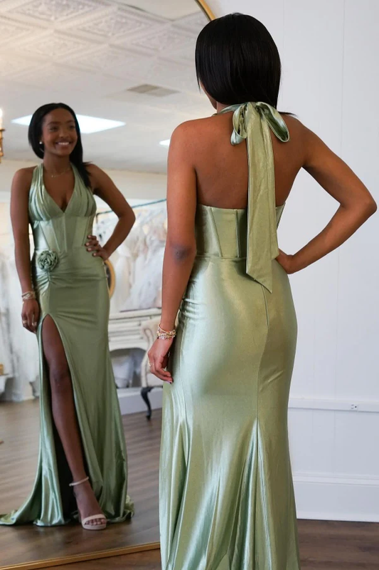 Low V Neck Halter Skeeveless Flower High Side Slit and Train Prom Dress