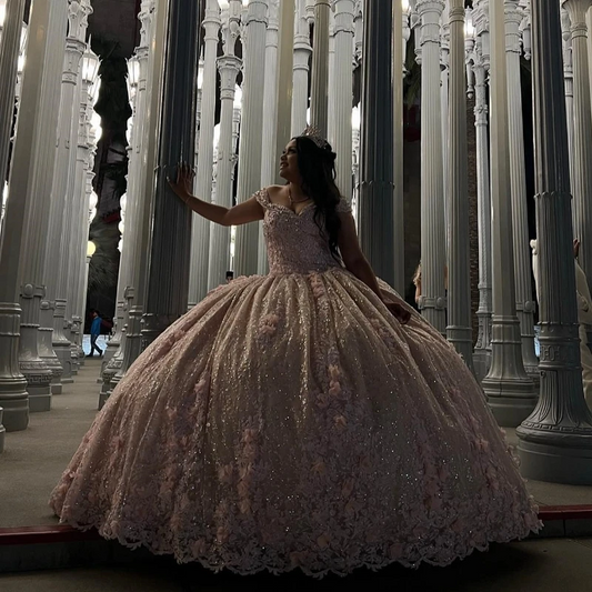 Pink Shiny Ball Gown Off the Shoulder Quinceanera Dresses 3D Flowers Appliques Lace Beads Tull Corset Vestidos De 15 Años