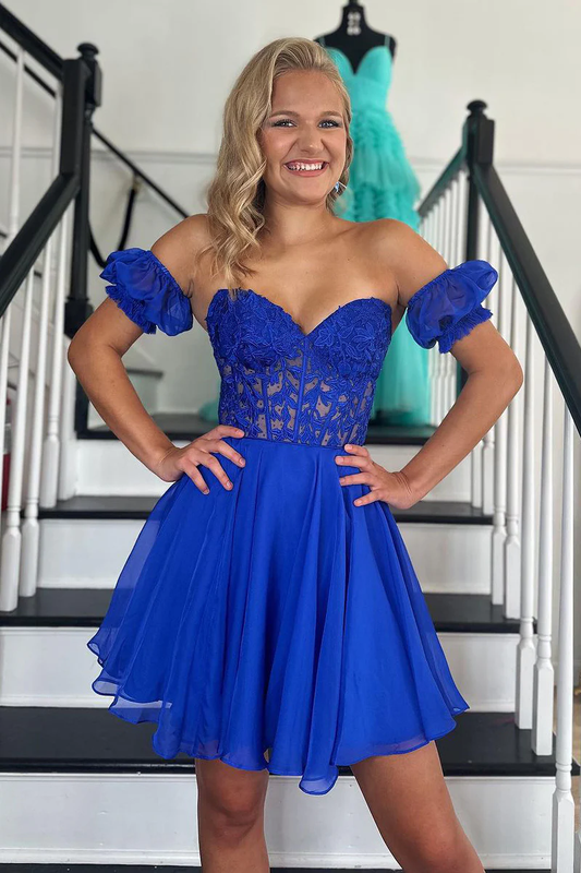 A Line Sweetheart Royal Blue Chiffon Short Homecoming Dress with Appliques