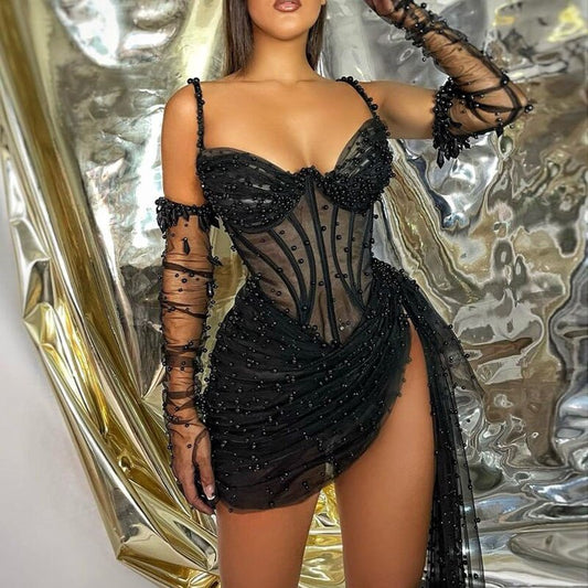 Chic Pearls Tulle Short Prom Dresses with Gloves Black Mini Party Dress for Homecoming Women vestidos elegantes para mujer