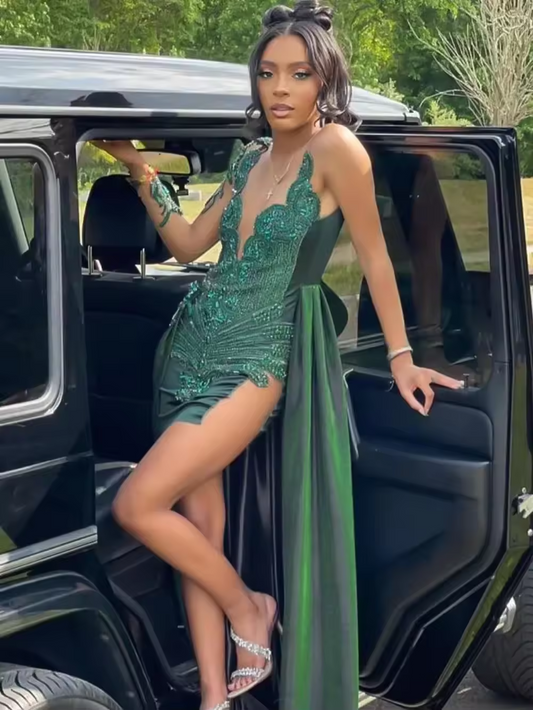 Emerald Green Diamond Short Homecoming Dress For Black Girl Customized Women Luxury Prom Birthday Party Dress with Overskirt