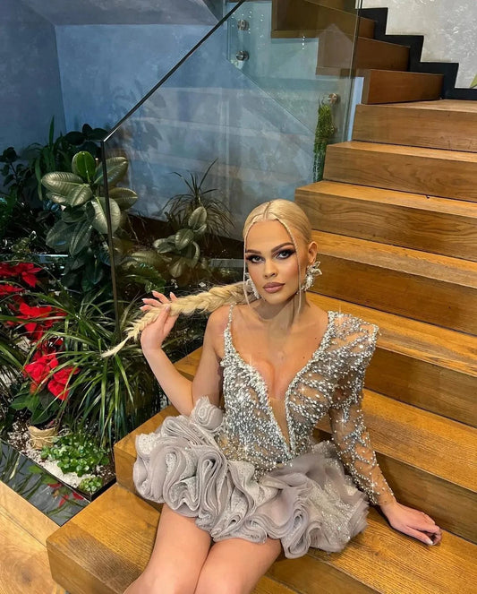 Luxury Ruffles Short Prom Dresses V Neck One Shoulder Beading Crystal Evening Gowns Sparkle Mini Cocktail Dress Custom Made