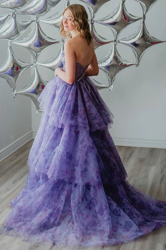 Cute A-Line Strapless Floral Print Tiered Chiffon Prom Dress with Slit