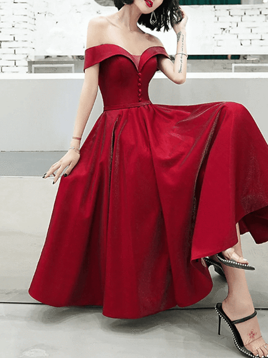 A-Line Minimalist Elegant Engagement Prom Dress Off Shoulder Short Sleeve Tea Length Satin with Sash / Ribbon Pleats Beading
