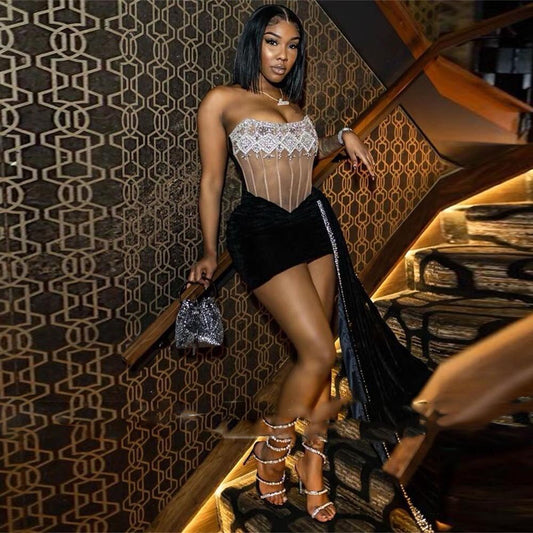 Sexy Party Dress Velvet Short Sheer Prom Dresses For Women Crystals Mini Gowns