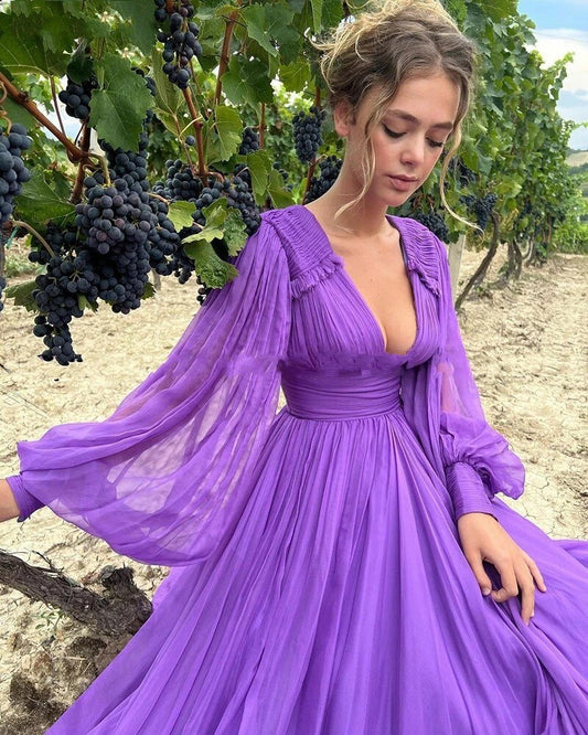 Chiffon V-Neck Evening Party Gowns Vestidos De Festa Fashion Pleats Floor-Length Long Sleeves Prom Dress Backless HOT