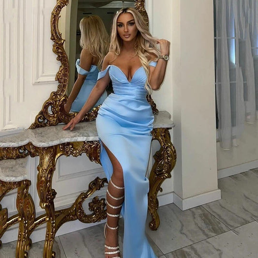Sky Blue Off The Shoulder Mermaid Evening Dresses For Women Pleats Prom Saudi Arabia Modern Side Split Party Dress