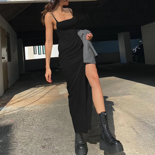 Elegant Black Spaghetti Straps Long Prom Dress With Split,Sexy Prom Gown