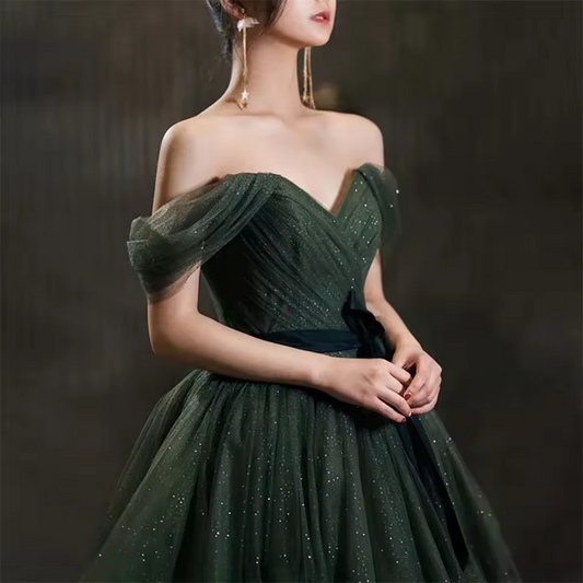 Lily Dark Green Shiny Formal Dresses V Neck Off The Shoulder Party Dress For Wedding A Line Special Occasion Dresses robe soirée