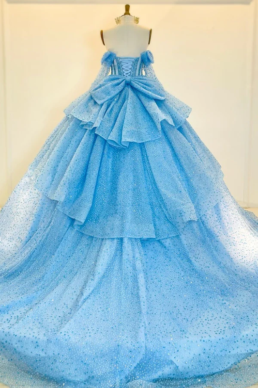 Off Shoulder Long Sleeves Blue Sweet 15 Quinceañera Dress with Bow Knot Beaded Sequins