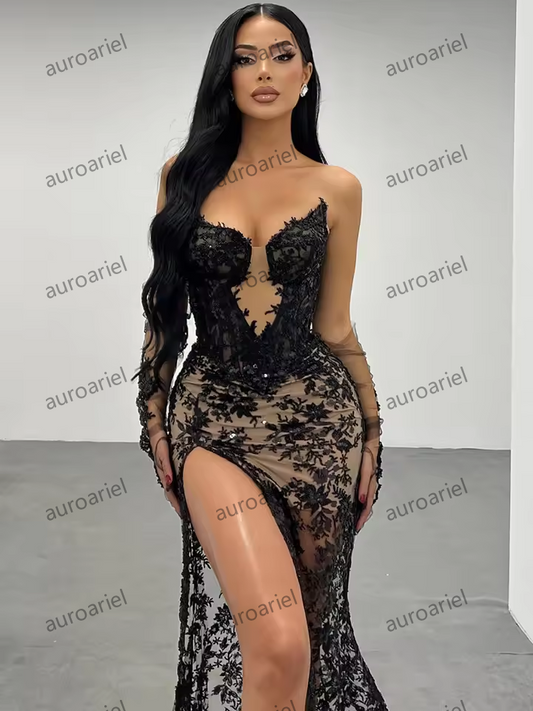 Black Lace Mermaid Long Dress Strapless V Neck High Slit Prom Party Evening Gown with Gloves