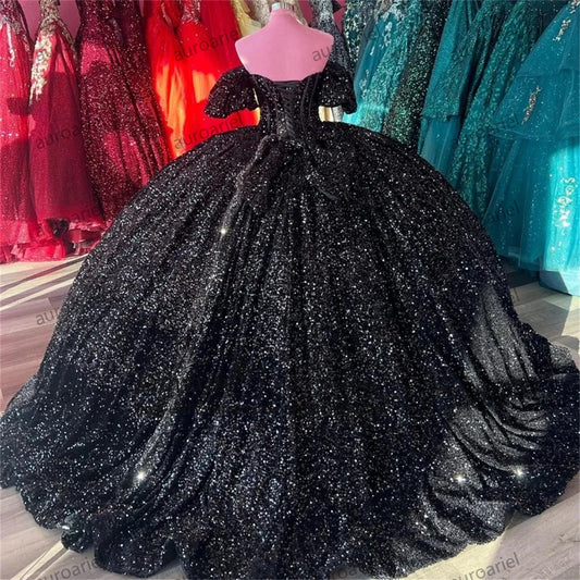 Black Shiny Quinceanera Dresses Sequined Beading Off The Shoulder Princess Ball Gown For Sweet 16 Girl Vestidos De 15 Años