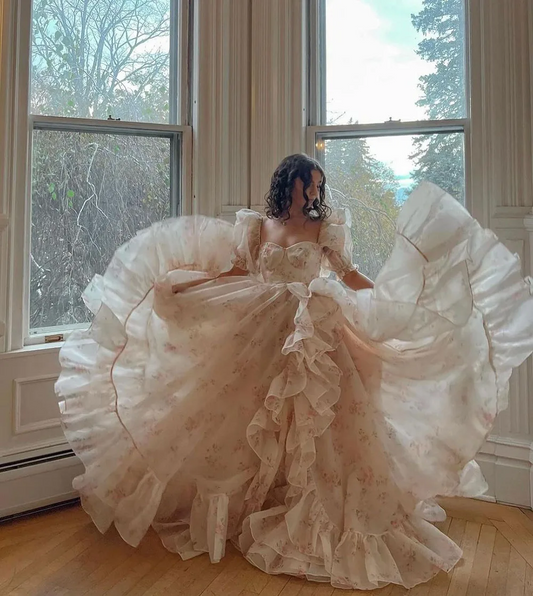 Floral Girl Evening Dresses Prom Dresses Graduation Birthday Party Dresses Ruffles Slit Prom Gown Puff Sleeves Dress