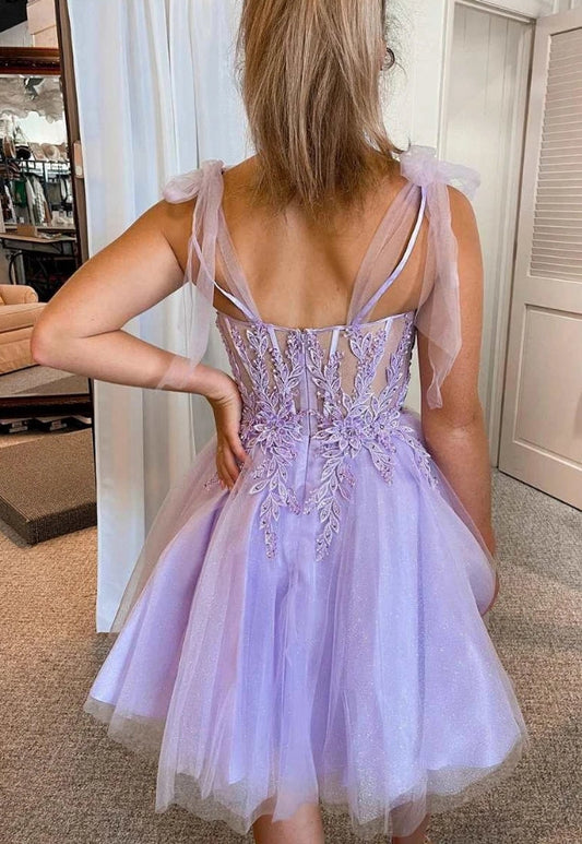 Elegant Lilac Lace Appliqued Homecoming Dresses Short Mini Beaded Women Party Wear Sexy Illusion Tulle Cocktail Dress