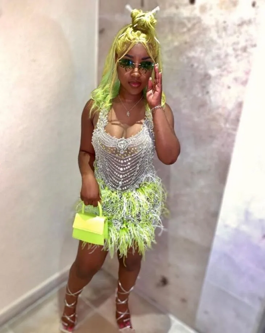 Luxury Green Diamond Crystal Birthday Homecoming Party Dress Beaded Feather Sheer Mesh Black Girl Formal Evening Gown