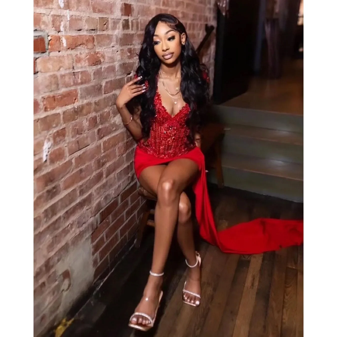 Red Sparkly Short Prom Homecoming Dresses with Side Train Luxury Diamond Crystal Birthday Party Gown