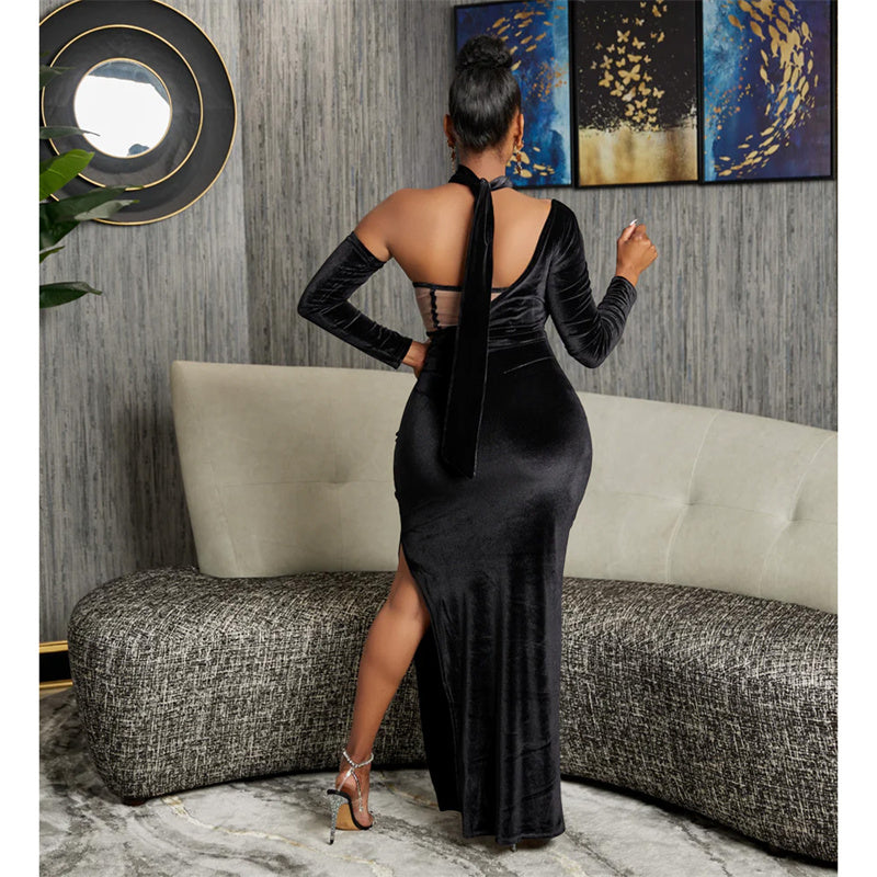 Elegant Birthday Party Night Club Christmas Formal Long Sleeve Dress Women Velvet Irregular Strapless Evening Vestidos