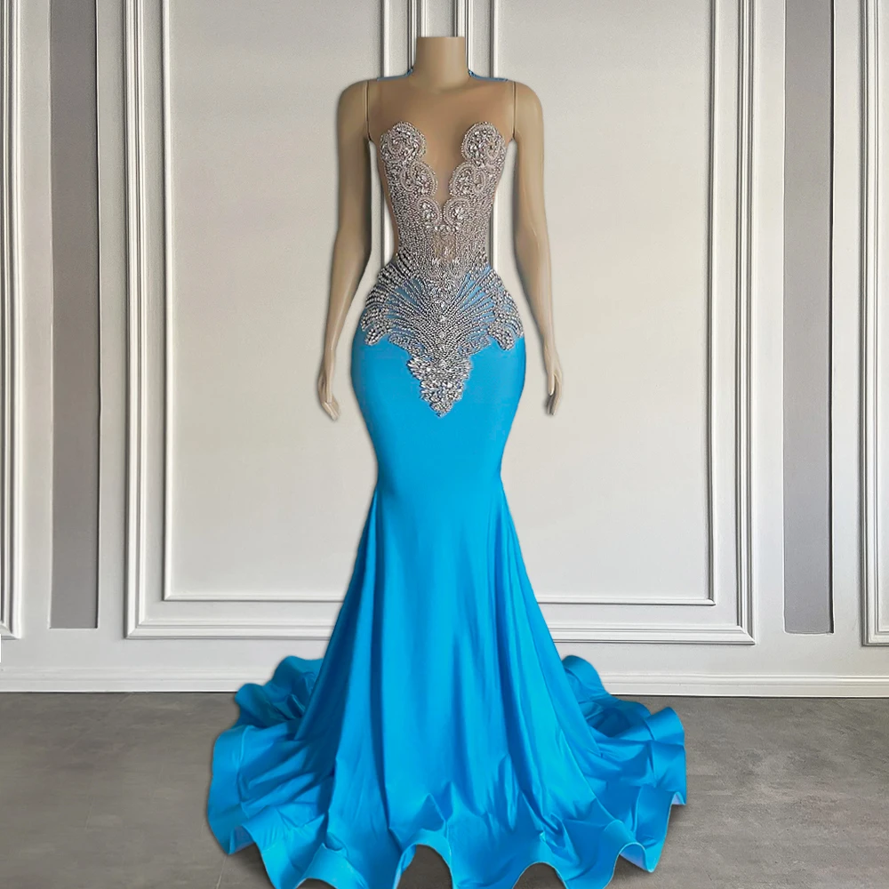 Elegant Blue Long Prom Dresses Luxury Crystal Beaded Mermaid Style Black Girls Prom Gala Gowns