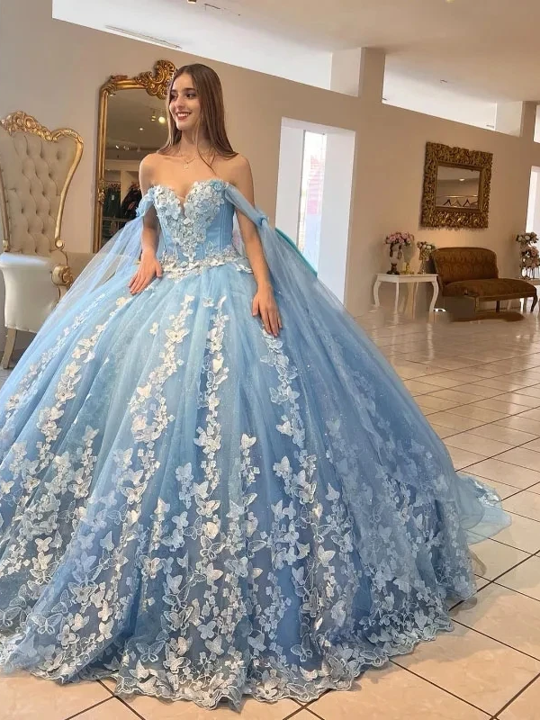 Glittering Light Blue Butterfly Quinceanera Dresses Off-Shoulder Luxury Lace