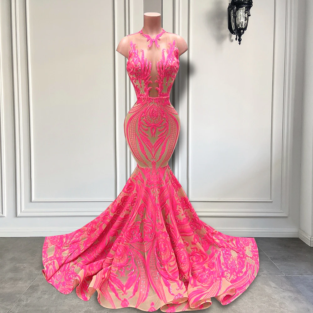 Hot Pink Long Prom Dresses Sexy Sheer O-neck Sleeveless Sparkly Sequin Black Girl Prom Party Gowns
