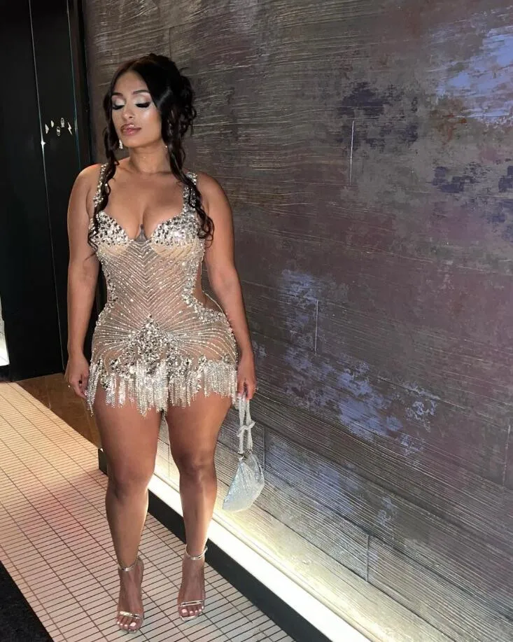 Ivy Silver Diamond Mini Evening Cocktail Dresses for Black Girl Sparkly Luxury Crystal Tassel Birthday Gala Dress Sheer Mesh
