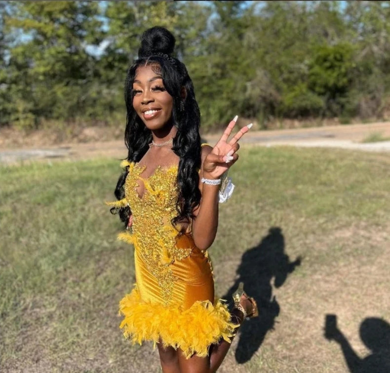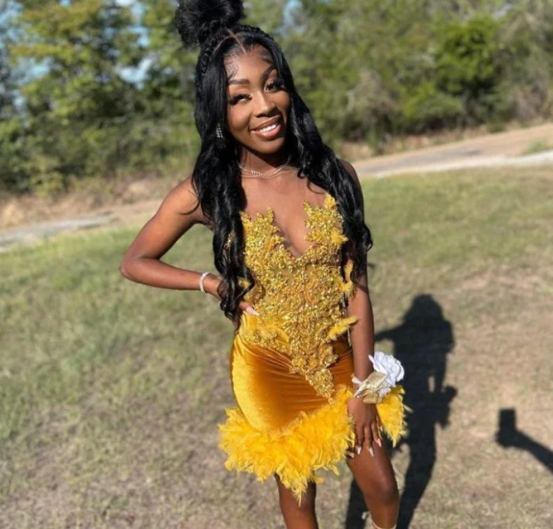 Luxury Gold Diamante Short Homecoming Party Dress Glitter Beaded Feather Black Teenage Birthday Queen Dress