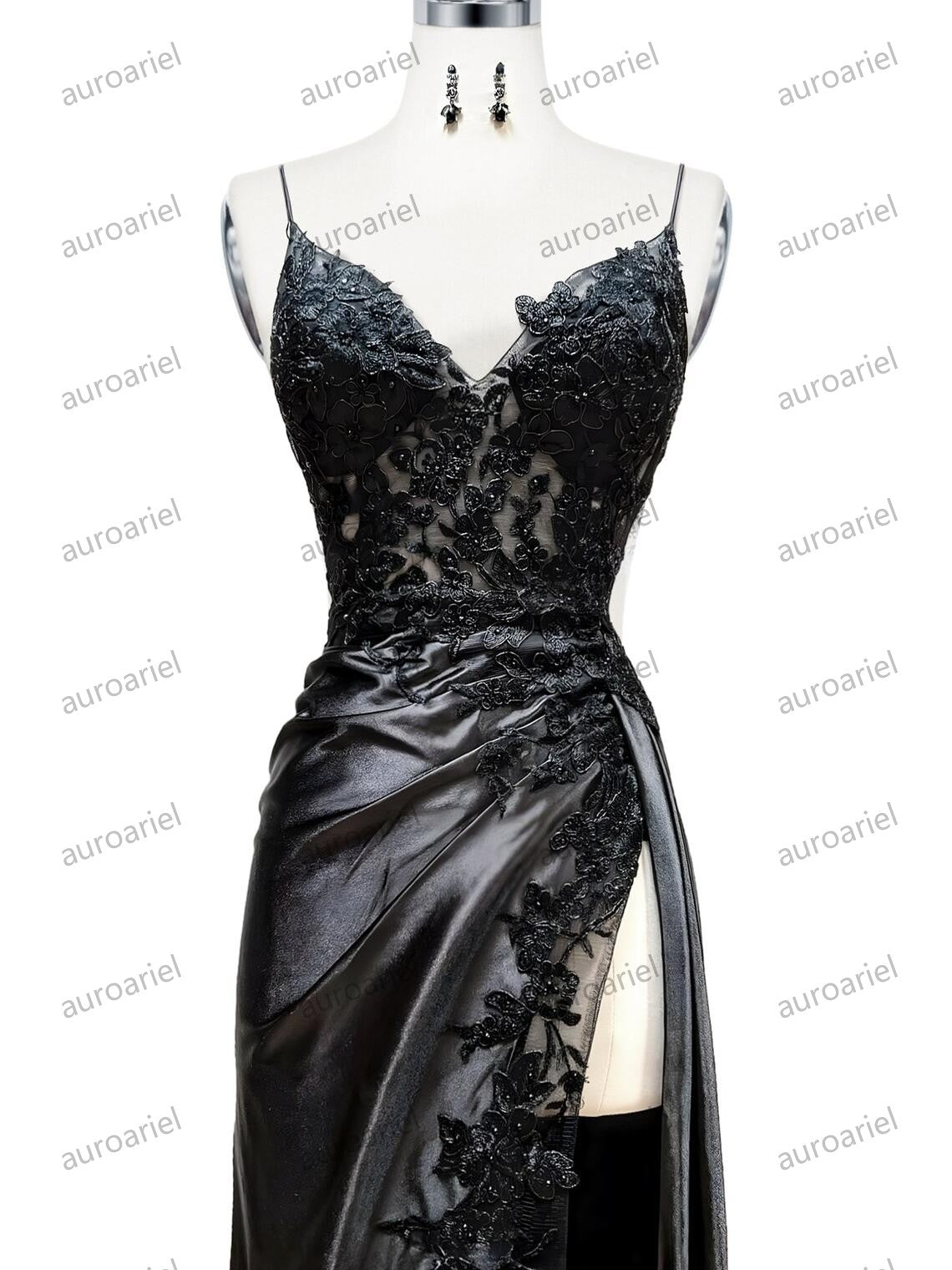 V Neck Black Mermaid Lace Prom Dresses, Black Mermaid Lace Formal Evening Dresses