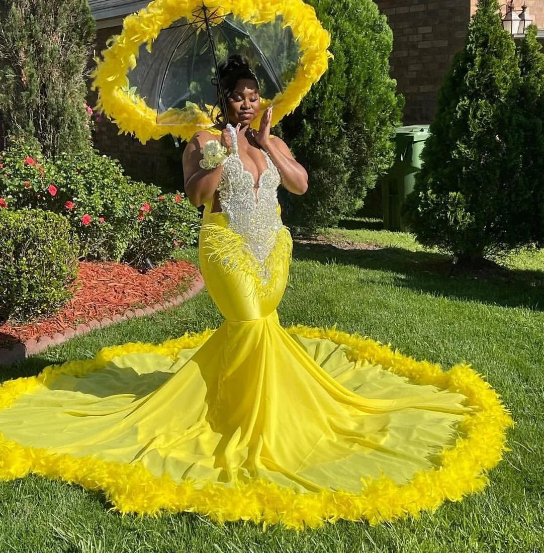Yellow African American Long Prom Dresses For Black Girls Mermaid Sheer Feather Crystals Women Party Evening Gown Customized