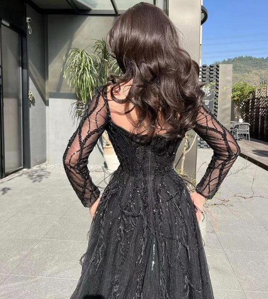 Real Image Prom Dresses Women Wear Side Slit Long Sleeves Beaded Evening Dress Sequins Feather Tulle Formal Occasion Party Gowns