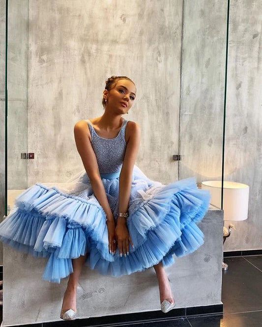 Round Neck Blue Shiny Cake Dresses, Ruffled Prom Dresses, Prom Dresses, Affordable Prom Dresses