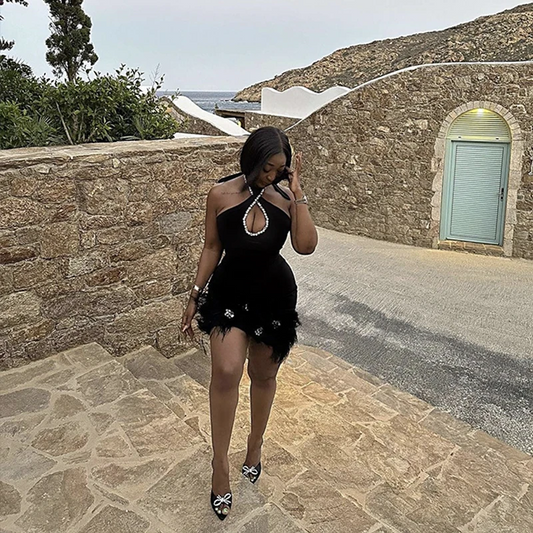 Women's Rose Red Spaghetti Strap Feather Mini Sexy Boutique Celebrity Cocktail Party Bandage Long Dress