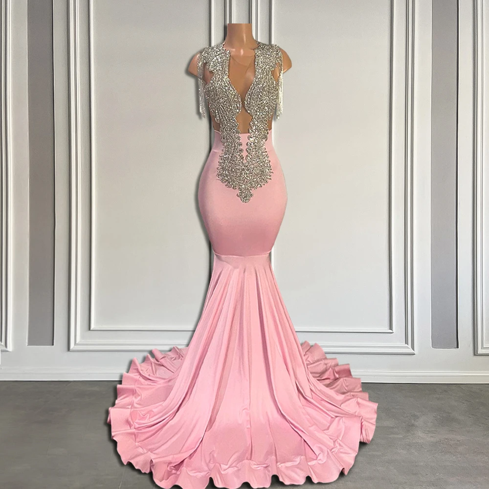 Luxury Diamond Long Pink Prom Dresses with Tassel Black Girl Sheer O Neck Beaded Mermaid Prom Gala Gowns