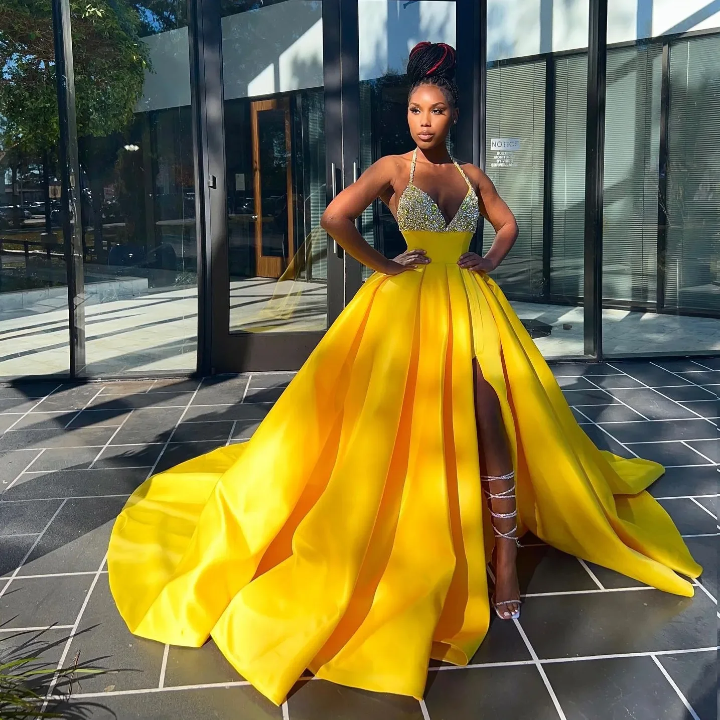 New Elegant ball dress Crystal beaded halter V-neck side split sequin evening dress line sweep train plus size formal dress