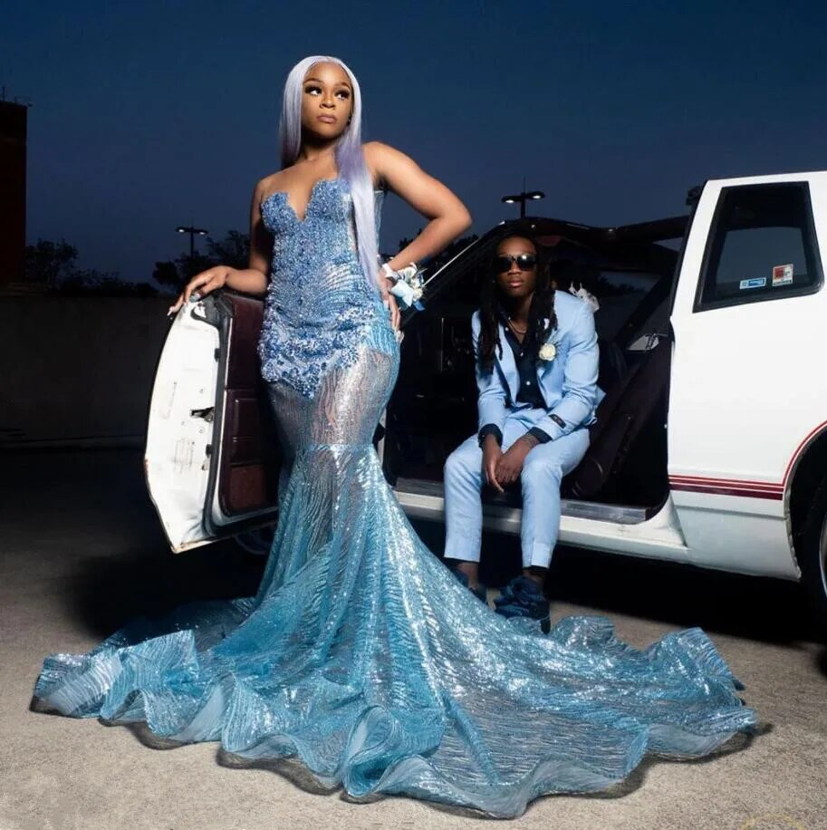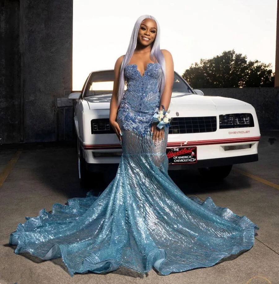 Pale Blue Trumpte Prom Formal Dress for Women Sparkly Diamond Crystal Black Girl Birthday Runway Gown Gillter Celcebrity dresses