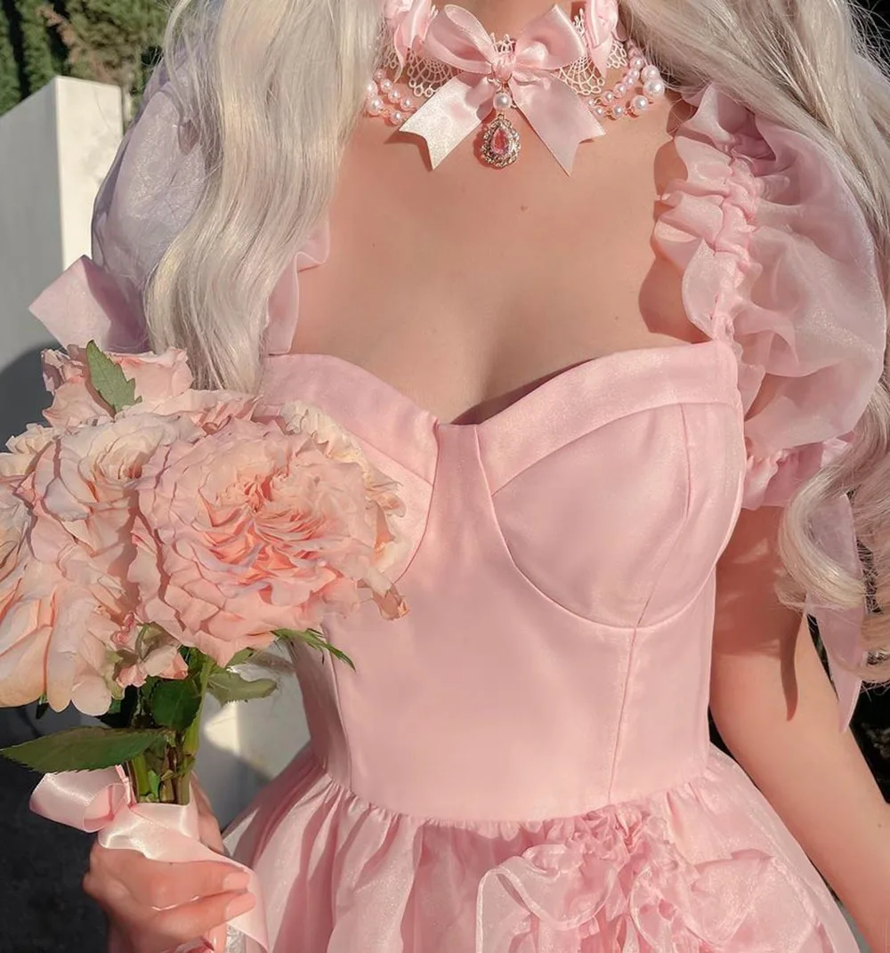 Pink Princess Prom Dresses Sweetheart Short Sleeves Ruffles Graduation Party Dress Long Exquisite Quinceanera Gowns