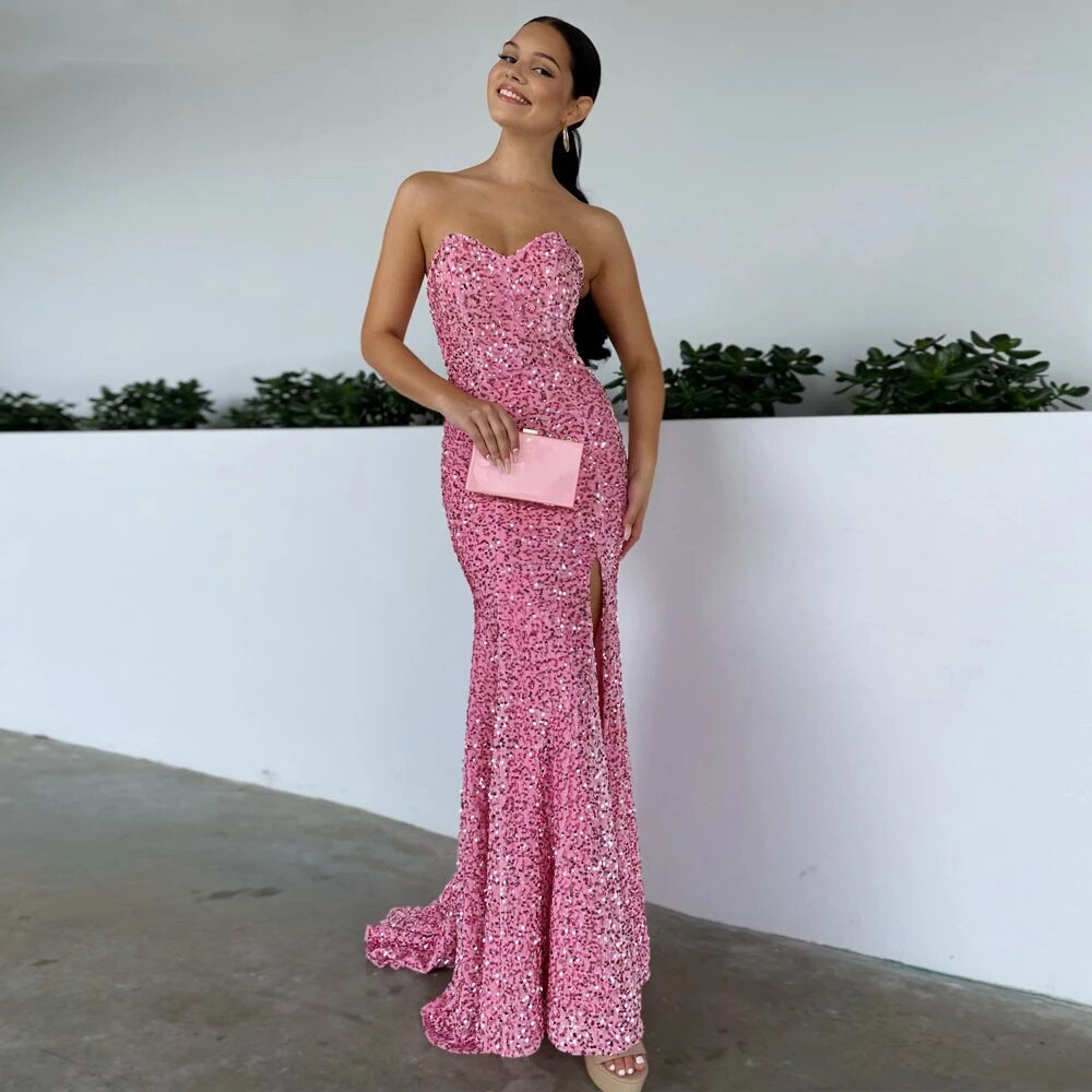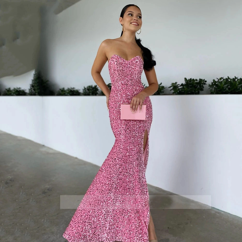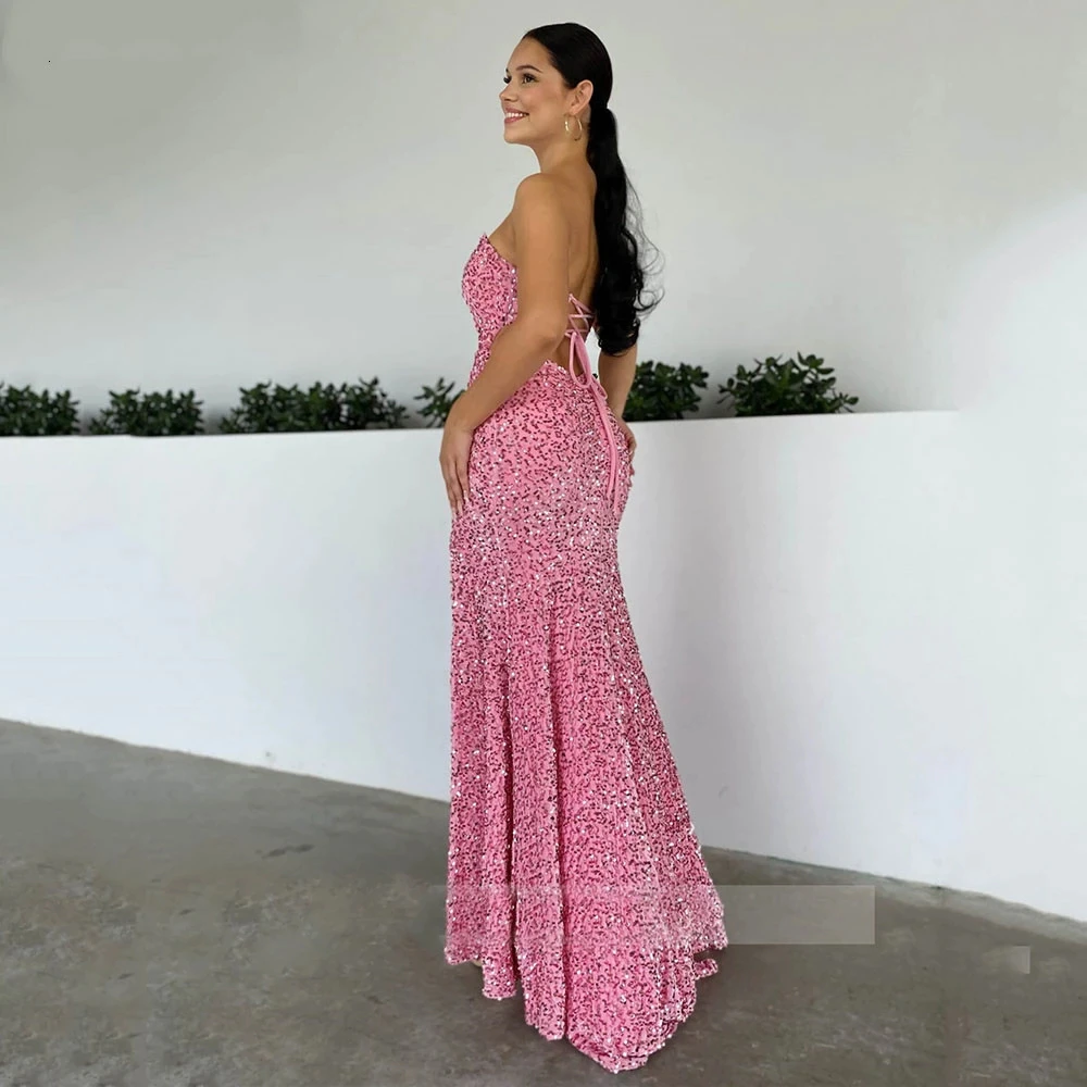 Pink Strapless Mermaid Evening Gowns Formal Sparkling Sequin Velvet Sexy Party Prom Dresses Robe De Soiree Femme