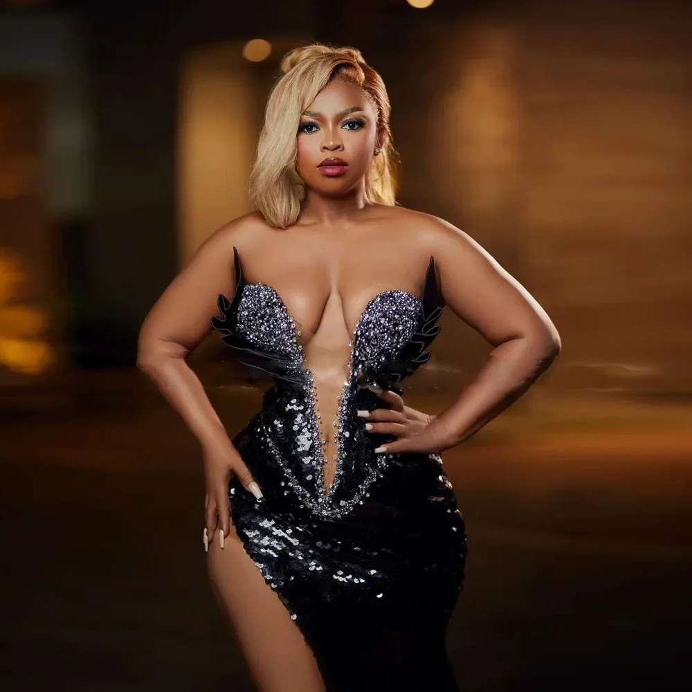 Sexy Black Sequined Party Dress Bead High Split Mermaid Prom Dress with Tain Off The Shoulder Evening Dresses Vestido De Fiesta