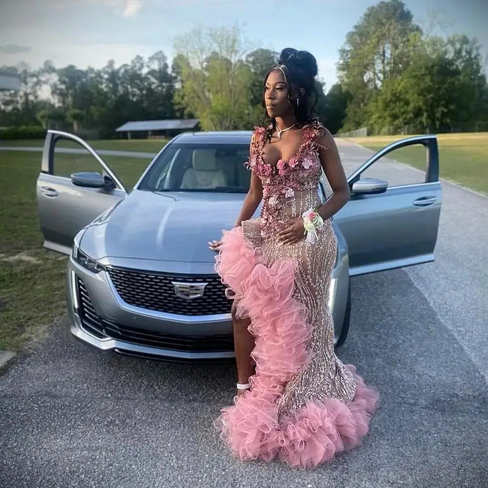 Sexy Evening Dresses With Flowers Lace Ruffles Bottom Black Girls Mermaid Prom Gowns Aso Ebi Party Dress Vestidos