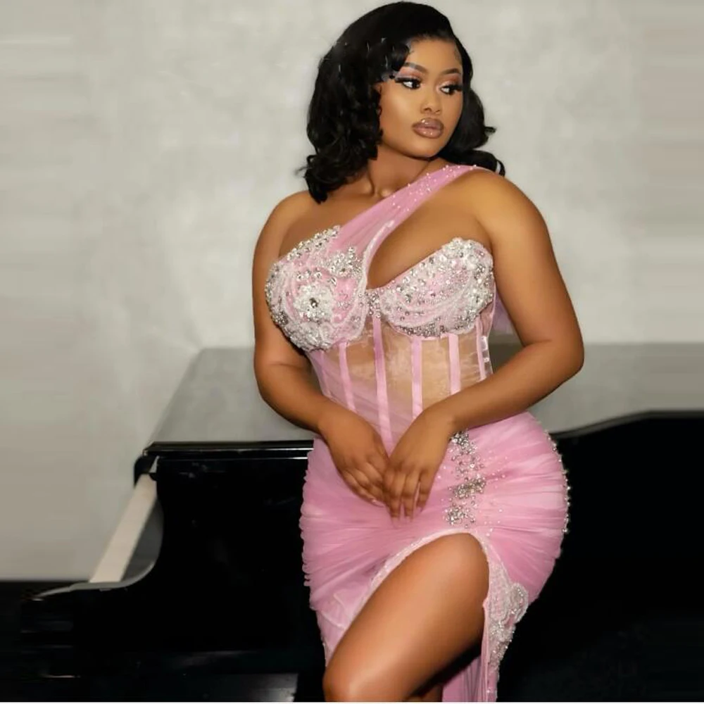 Sexy High Slit Prom Dresses One Shoulder Lace Appliques Beads Mermaid Evening Dress Exposed Boning African Women Party Vestidos