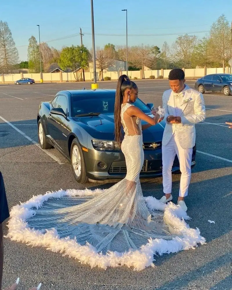 Sexy Sheer Neck Mermaid Prom Dresses For Black Girl White Sequins Plus Size Formal Evening Occasion Gowns