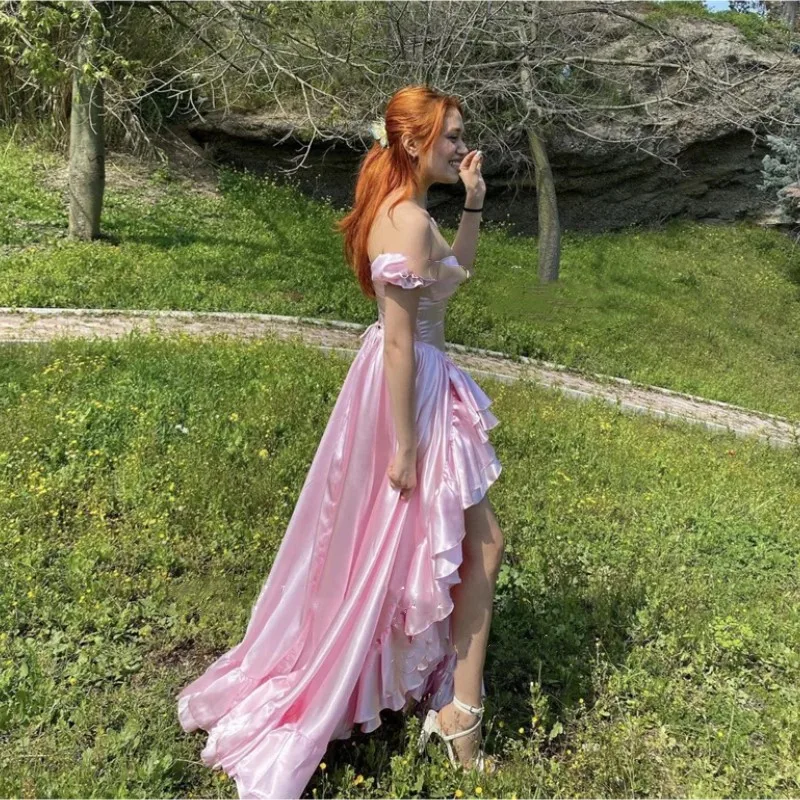 Sexy Sweeetheart Pink Prom Party Dresses Detachable Short Sleeves Ruffles Silk Split Evening gowns Formal Sexy Dresses For Woman