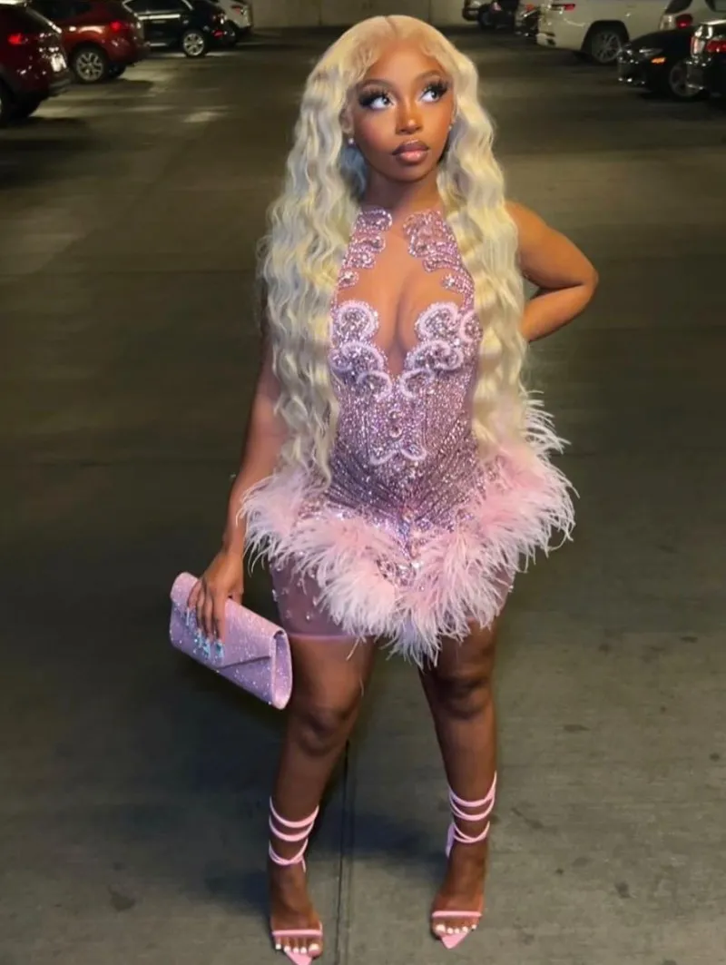 Short Feathers Prom Dreses Fitted Black Girls Birthday Party Gowns Rhinestone Beading