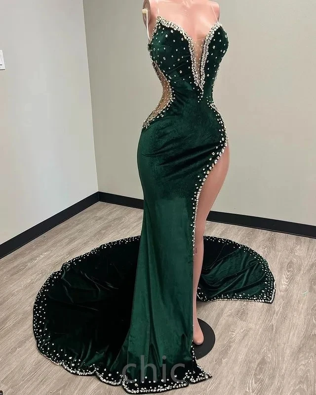 Slit African American Prom Dresses Mermaid Spaghetti Straps Velvet Beaded Black Girls Nigeria Saudi Arabia Evening Dresses Gown