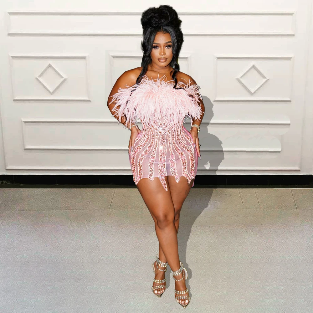 Sparkly Crystals Feather See Through Black Girls Short Prom Dresses African Women Mini Cocktail Party Gowns For Birthday