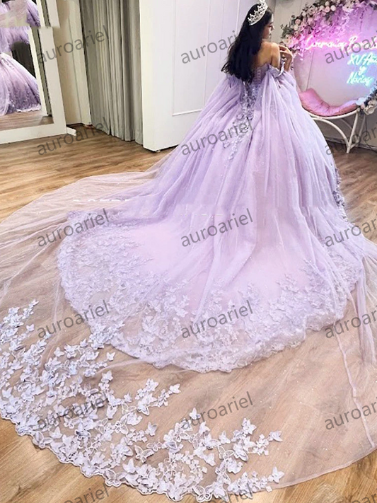 3D Butterfly Ball Gown Lilac Quinceanera Dresses With Cape Appliques Lace Sweet 15